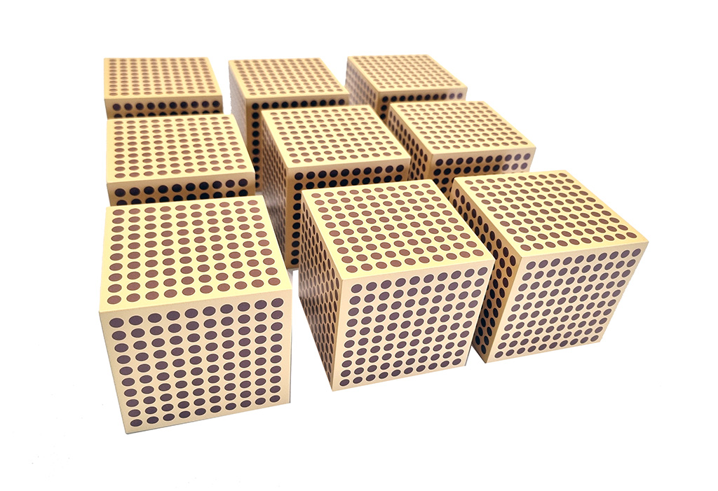 Set de 9 cuburi din lemn cu fetele pictate cu 100 de buline. Acesta material face parte din materialul numit Banca.