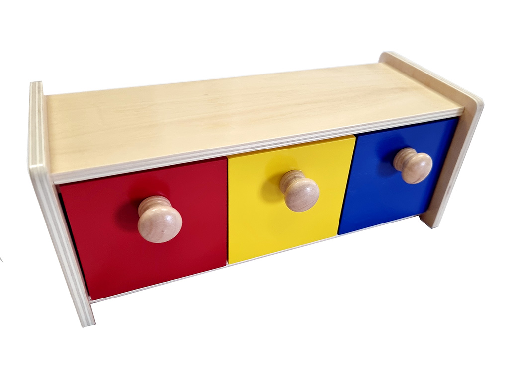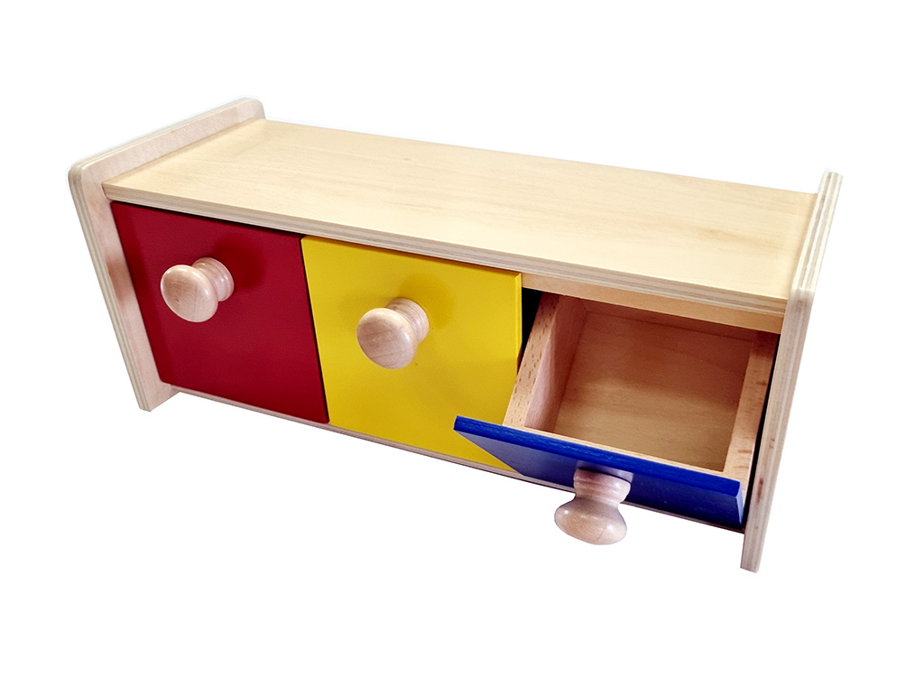 For babies (approximately 8-12 months), the “3-drawer box” is a material for hand-eye coordination and understanding of object permanence, being an evolution of the simple box with a single drawer.