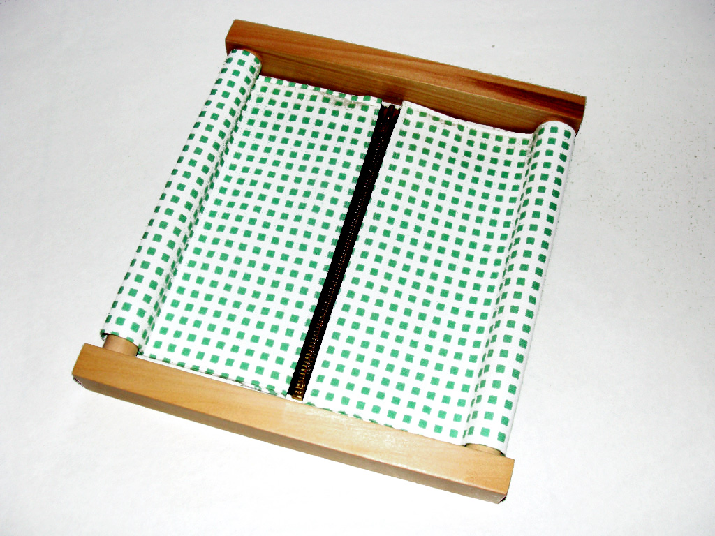 A small wooden frame with two pieces of fabric (one on each side) and a large zipper. The child practices the movement of aligning the two pieces of fabric and pulling the zipper up and down. This helps the child become more confident and prepared when dressing independently.
