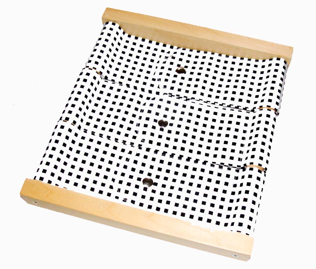 A small wooden frame that has six pieces of fabric (three on each side), with metal snaps. This helps the child learn how to open and close the fabric using the metal snaps, this movement is simple and concrete which helps the children review the same movement which leads to the independence of the movement.