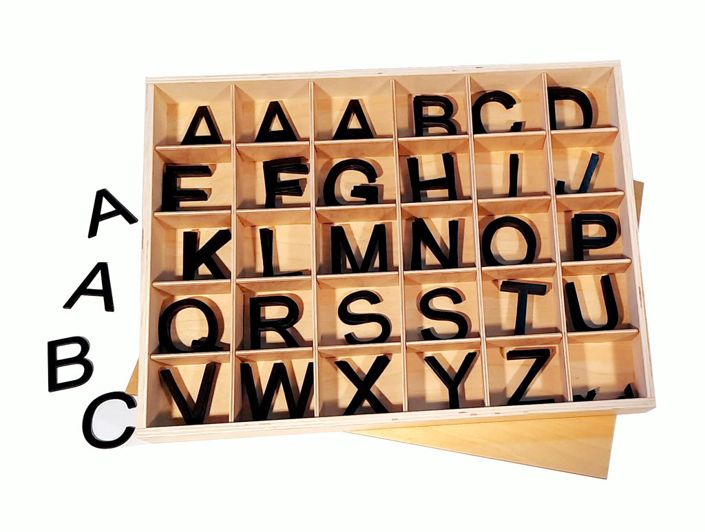 Alfabetul mobil contine 185 de litere(20 a, 20 i, 10 o, 10 e, 10 u si cate 5 bucati din fiecare consoana) plus sedilele si caciulitele necesare formarii diacriticelor din limba romana. Inaltimea literei este de 6 cm. Acestea sunt depozitate intr-o cutie din placaj din lemn, cu capac.