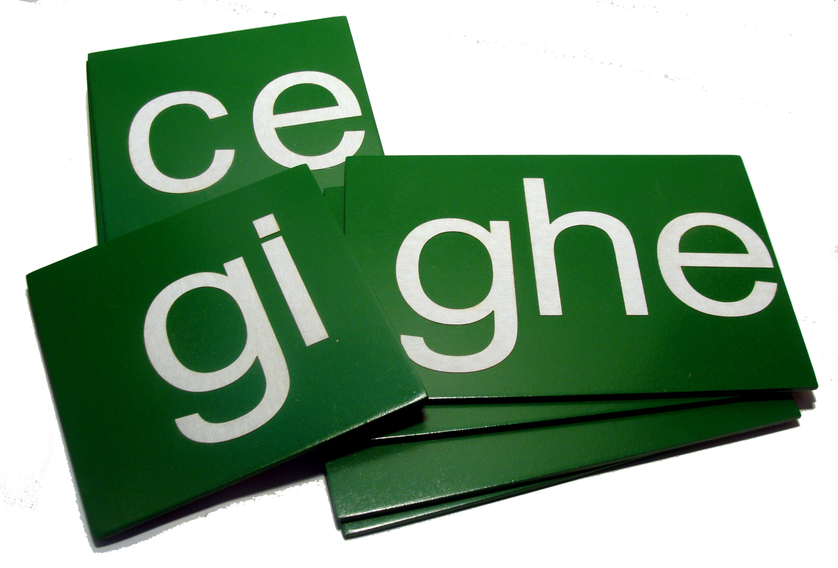 Placi de lemn cu glasspapier care prezinta digramele. Acest material îl ajută pe copil să facă o legătură între sunet și antingerea literelor, deoarece copilul folosește acest material ținând placa de lemn cu mâna non-dominanta și trasând degetul arătător și degetul mijlociu cu mâna dominantă pe glasspapierul digramelor.