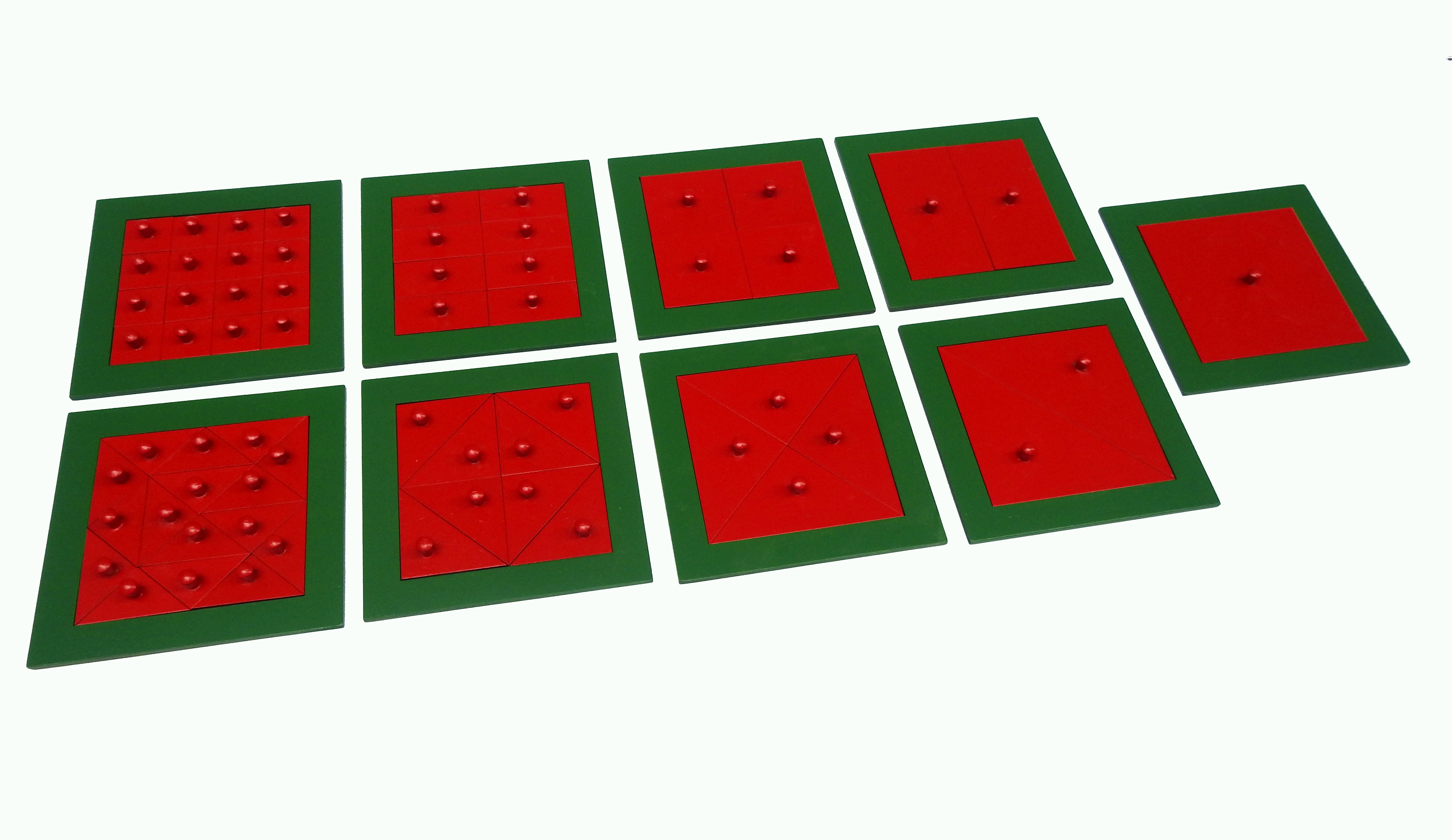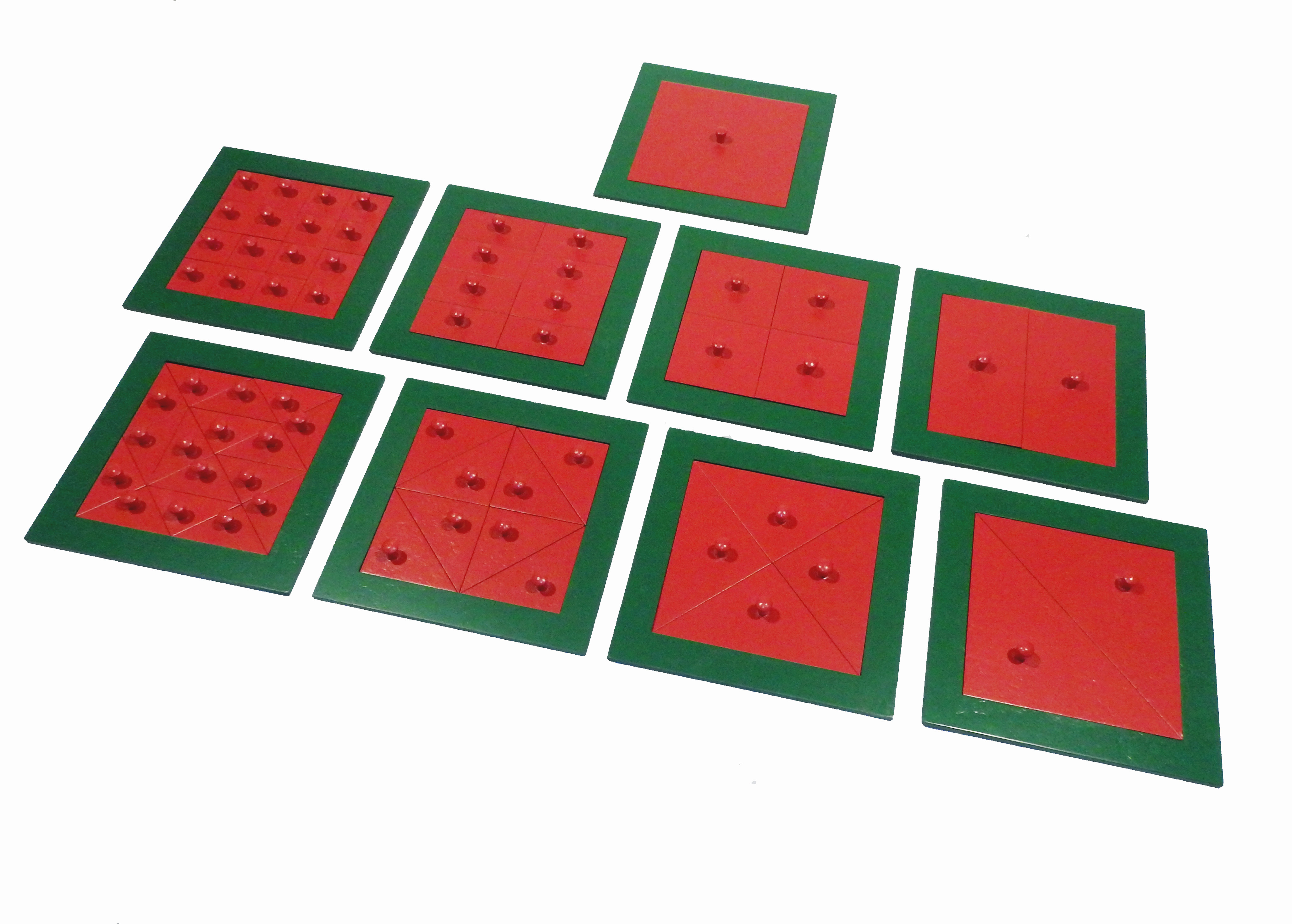 Inserturile patrat sunt realizate din MDF vopsit si lacuit. Produsul este compus din 9 placi cu un patrat impartit in 2, 4, 8, si 16 patrate si 2, 4, 8 si 16 triunghiuri. Nu sunt incluse standurile, acesta pot fi achizitionate separat.