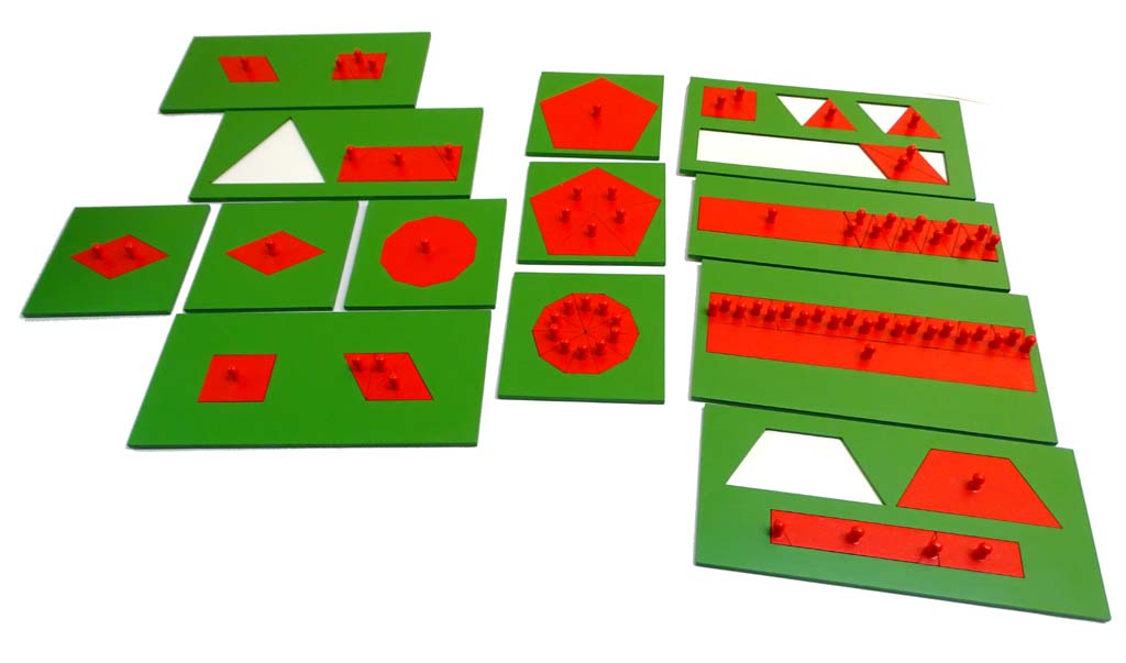 The material for area equivalence provides experience in studying the relationship between equivalent geometric figures and helps the child to discover areas and theorems. The material consists of 13 green MDF boards with red insets.