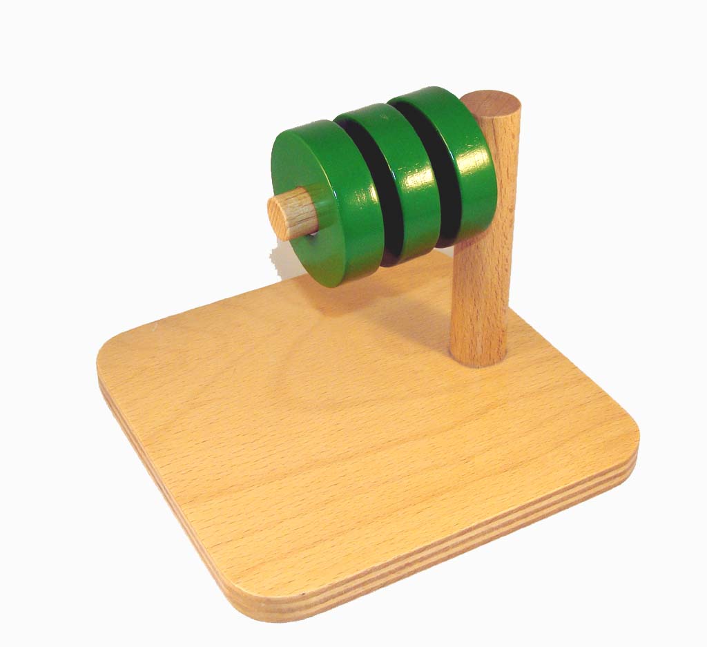 The set consists of a solid wooden base and a horizontal rod (or "dowel") onto which the child must insert three colored wooden disks (usually green). The disks are sized specifically for young children's hands to facilitate a correct grip without causing strain.