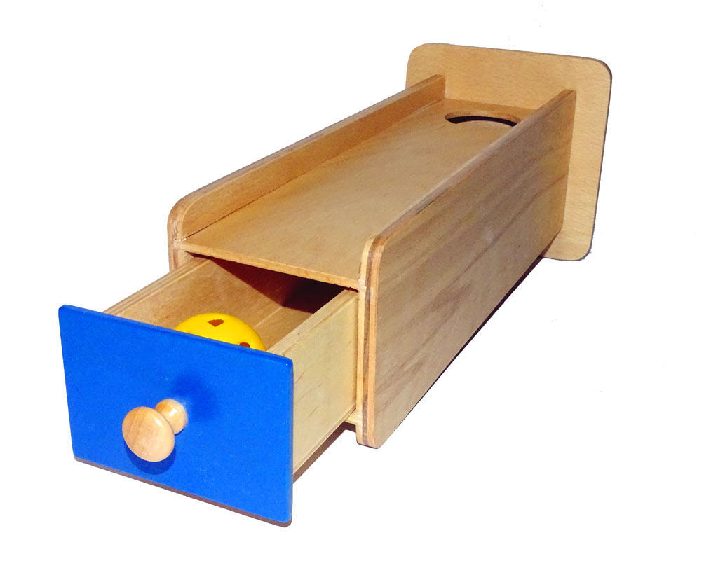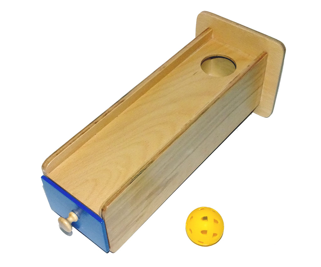The Montessori Permanence Box with Drawer is a wooden educational material that helps children understand the concept of object permanence (that an object exists even if they cannot see it) and develop fine motor skills (hand-eye coordination and finger control), by inserting a ball into a hole, which falls into a drawer that the child opens to retrieve it.