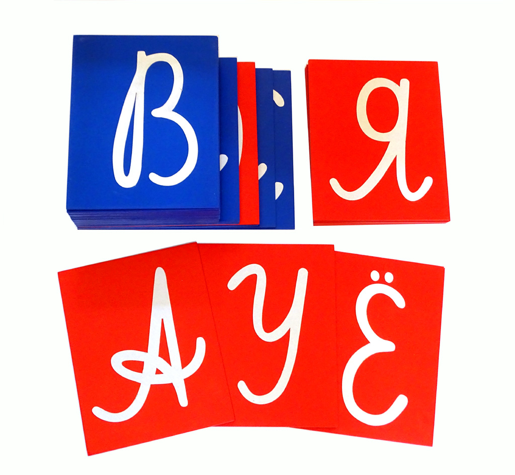 Wooden boards featuring capital cursive letters of the Cyrillic alphabet. Each letter is cut from fine sandpaper and mounted on a smooth wooden surface, often color-coded to distinguish vowels and consonants. The cursive style helps children associate printed and written forms of the Cyrillic letters. This material helps the children learn the feel and sound of the letters; it helps them with writing after they have learned these letters. The child uses this material by holding the wooden board with its non-dominant hand and traces its index and middle finger with his dominant hand on the sandpaper letters.