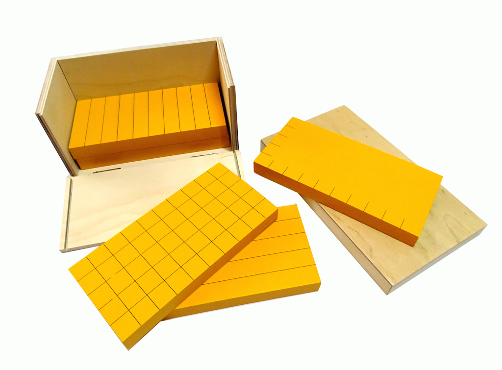 This material are used in calculating the volume of a rectangular prism. The material consists of 5 wooden rectangular prisms (20 x 10 x 2 cm) painted yellow and ruled in lines and squares. The prisms are stored in a hinged wooden box with lid.