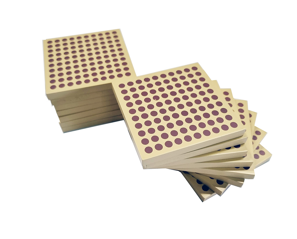 Setul contine 45 de patrate din lemn avand pictate 100 de buline pe fiecare fata. Acest material face parte din materialul numit Banca